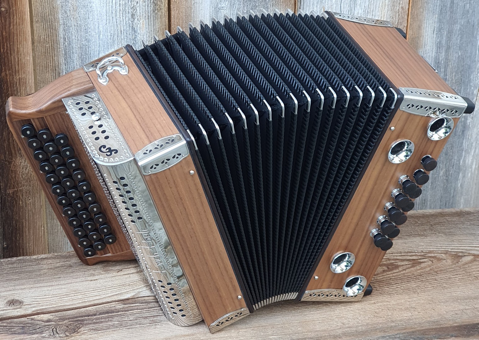 Im Diskant alle Töne 3-chörig, im Bass stehender Doppelhelikon.